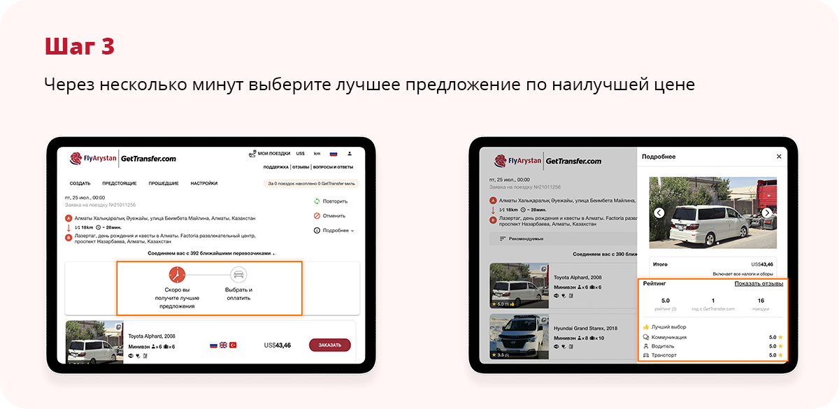 После оформления заявки пассажиры получают предложения на субдомене GetTransfer.com и могут выбрать лучший вариант по цене и комфорту